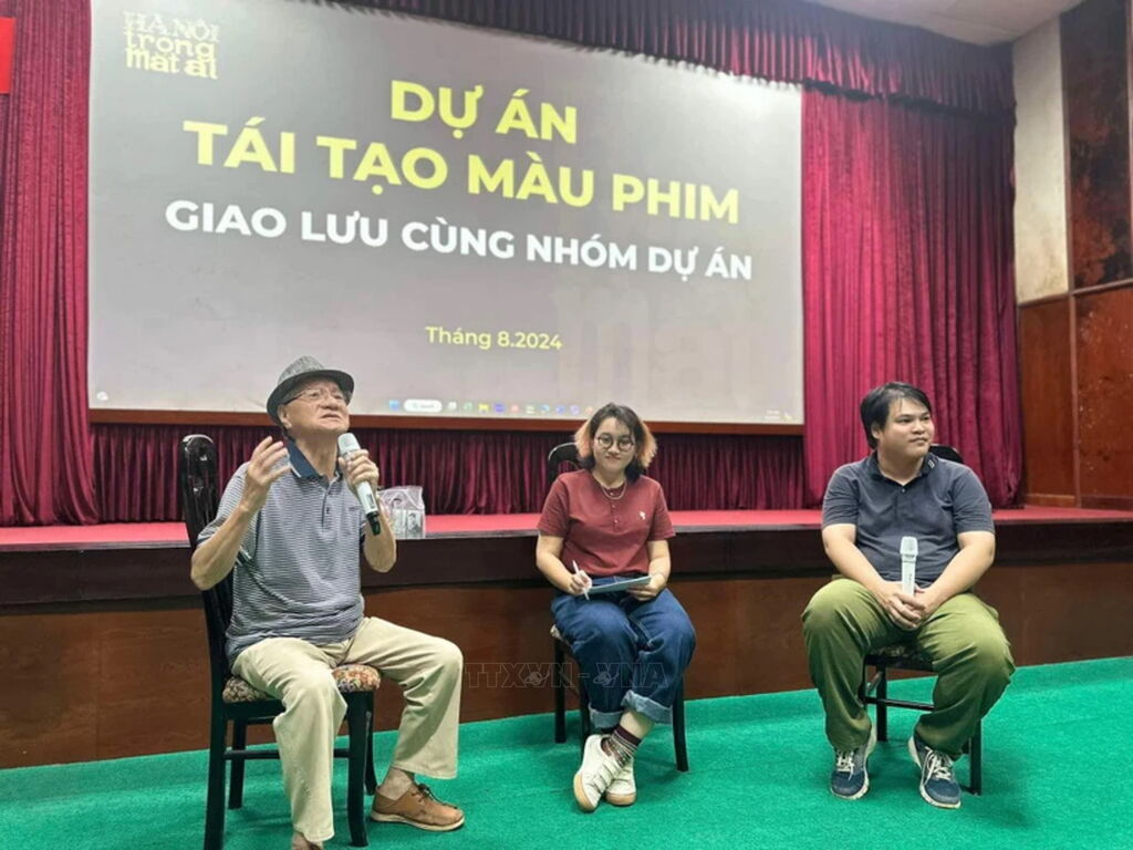 | Đạo diễn, Nghệ sỹ Nhân dân Trần Văn Thủy và hai bạn trẻ Thanh Uyên, Hồng Quang của dự án tái tạo màu tự nhiên phim "Hà Nội trong mắt ai." (Ảnh: NVCC) |