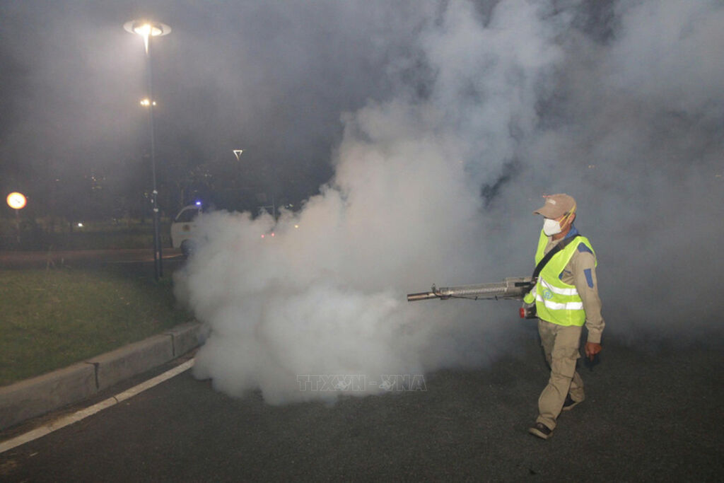 | CDC Hà Nội phối hợp cùng các đơn vị liên quan tiến hành phun hóa chất phòng bệnh. (Ảnh: PV/Vietnam+) |