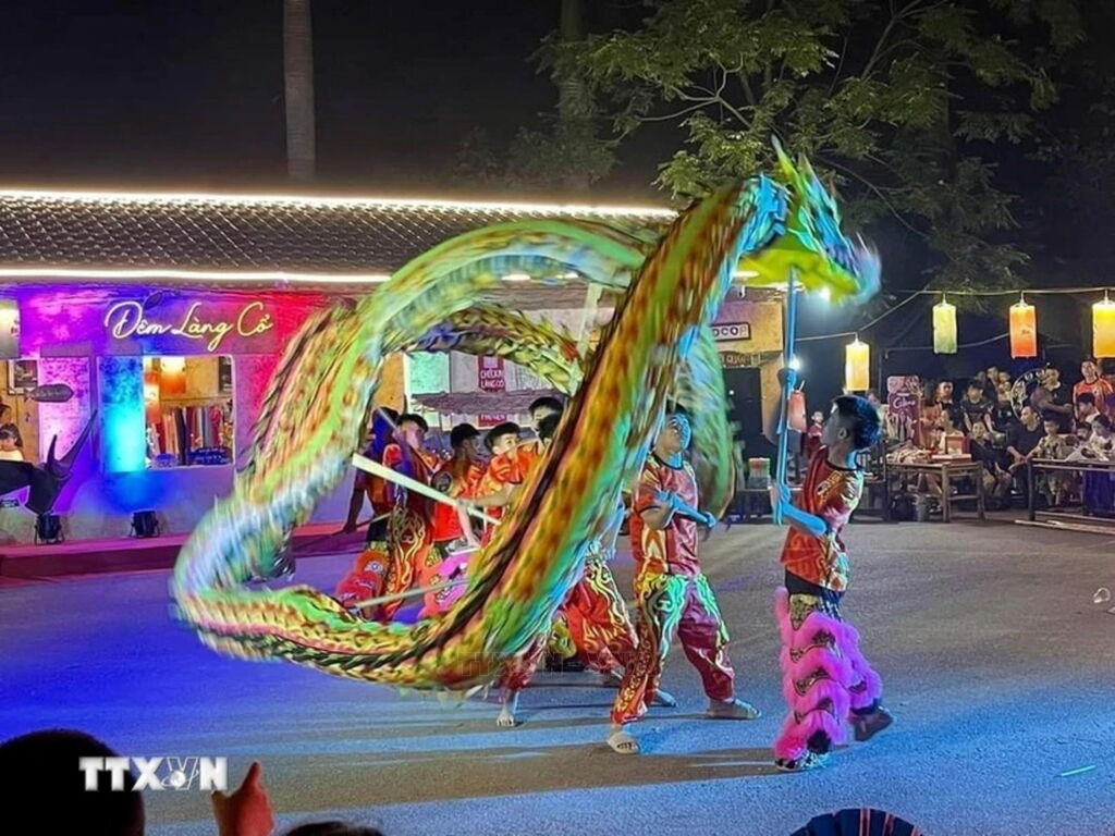 | Biểu diễn múa rồng trong chương trình "Đêm làng cổ" Đường Lâm. (Ảnh: Minh Quân/TTXVN phát) |