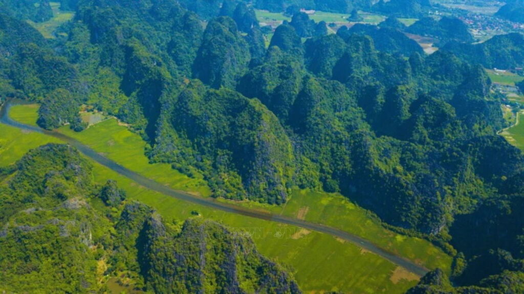 | Nhìn từ trên cao, Tam Cốc tựa Vịnh Hạ Long trên cạn với những dãy núi đá vôi trầm mặc trên mặt nước. (Ảnh: Minh Đức/TTXVN) |