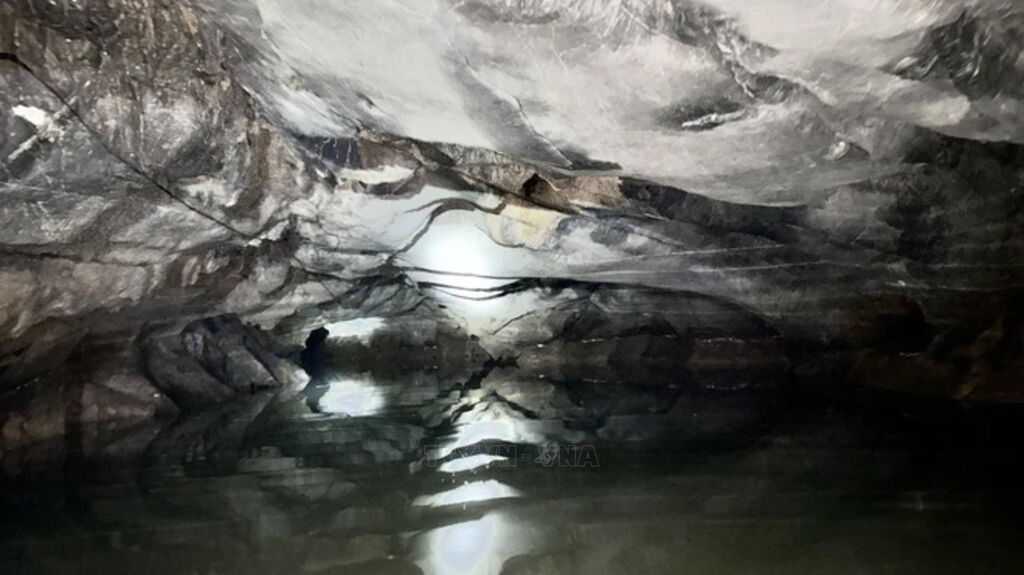 Trước khi vào động khô, du khách sẽ ngồi thuyền đi qua Xuyên thủy động - một động tối ngập nước, có hình dạng tựa như đường ống bán nguyệt, chiều dài khoảng 350m, chiều rộng khoảng 6m. Trần và vách động khá bằng bằng, có hình vòm cung với vô số nhũ đá rủ xuống rất đẹp.