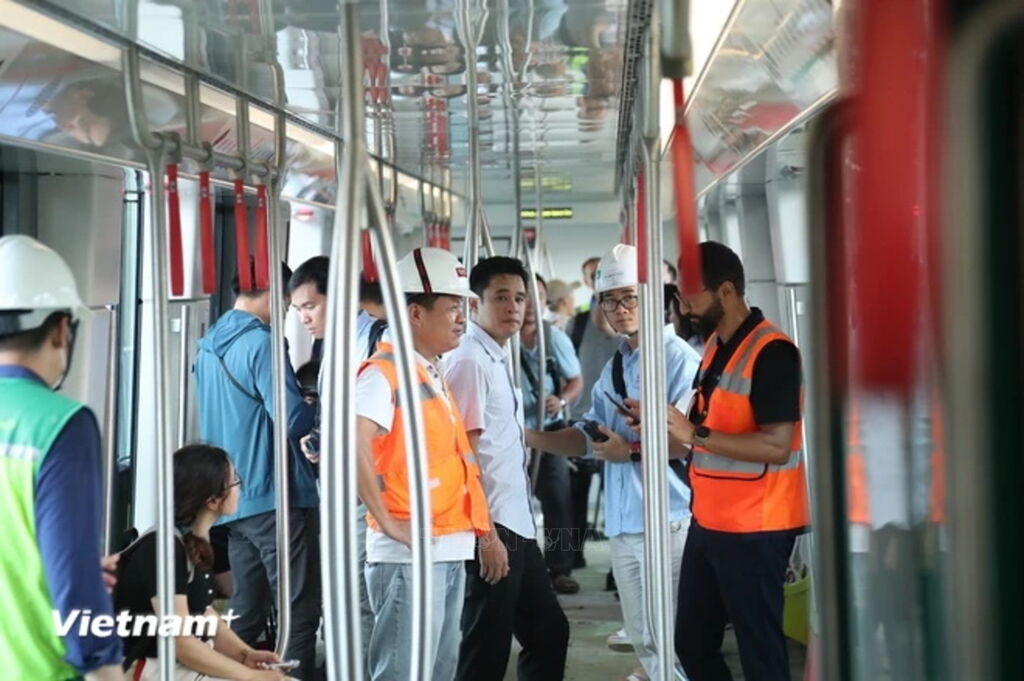 | Đông đảo các cơ quan thông tấn, báo chí đã có buổi trải nghiệm thực tế chạy thử tàu Nhổn-Ga Hà Nội. (Ảnh: PV/Vietnam+) |