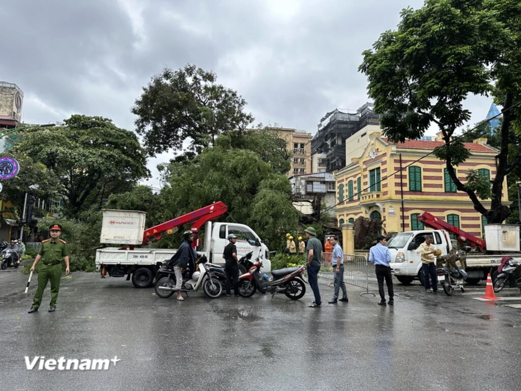 | Các lực lượng chức năng của Hà Nội tiến hành phân luồng, đảm bảo an toàn giao thông sau mưa bão. (Ảnh: Xuân Quảng/Vietnam+) |