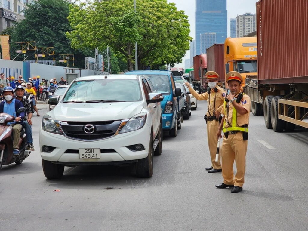 | Lực lượng cảnh sát giao thông tổ chức phân luồng phương tiện đi lại. (Ảnh: PV/Vietnam+) |