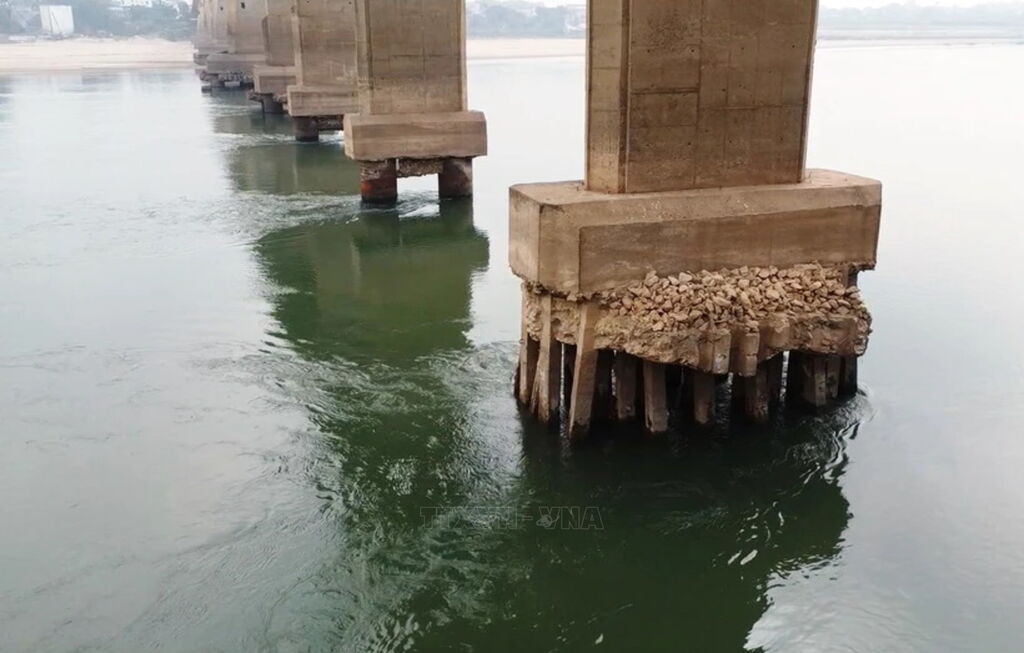 | Cầu Trung Hà bắc qua sông Đà, nối Hà Nội và Phú Thọ hiện bị hư hỏng, xói lở trụ cầu, đang trong quá trình sửa chữa nên phía tỉnh Phú Thọ cấm xe lưu thông qua cầu. (Ảnh: PV/Vietnam+) |