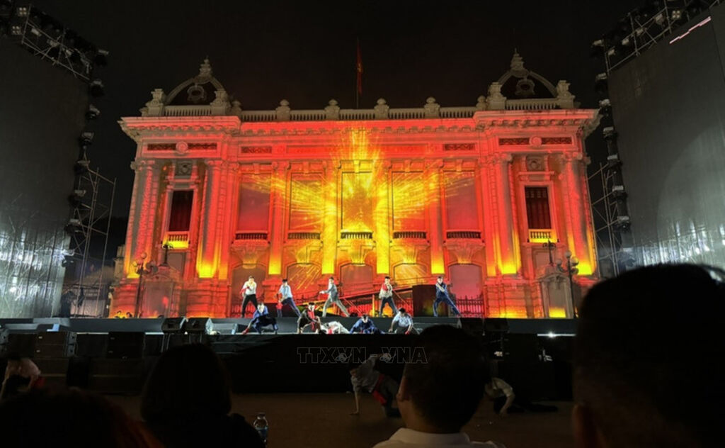 | Trình diễn ánh sáng trên phông nền Nhà hát Lớn Hà Nội. (Ảnh: PV/Vietnam+) |
