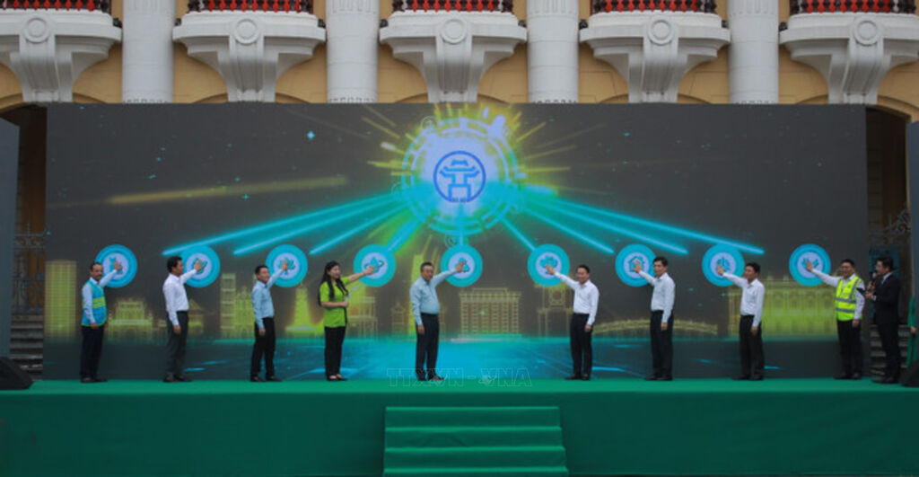 | Các đại biểu "nhấn nút" phát động tại sự kiện ra quân. (Ảnh: Minh Anh/Vietnam+) |
