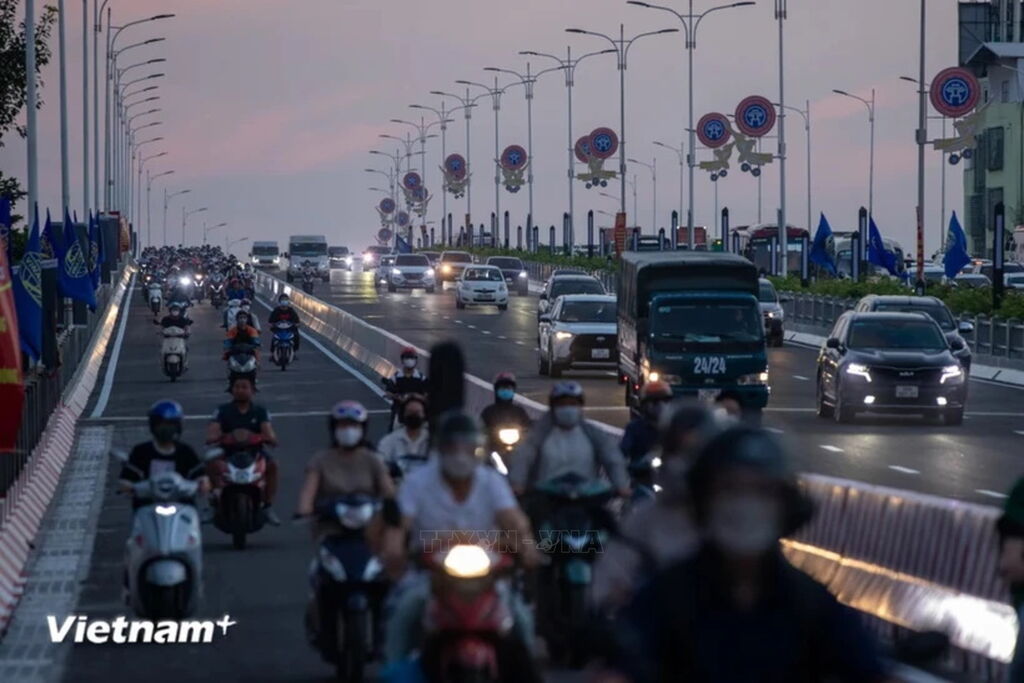 | Phương tiện lưu thông trên cầu Vĩnh Tuy để xuống nút giao Cổ Linh. (Ảnh: PV/Vietnam+) |