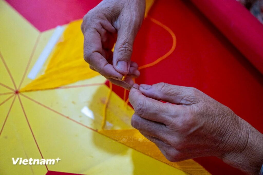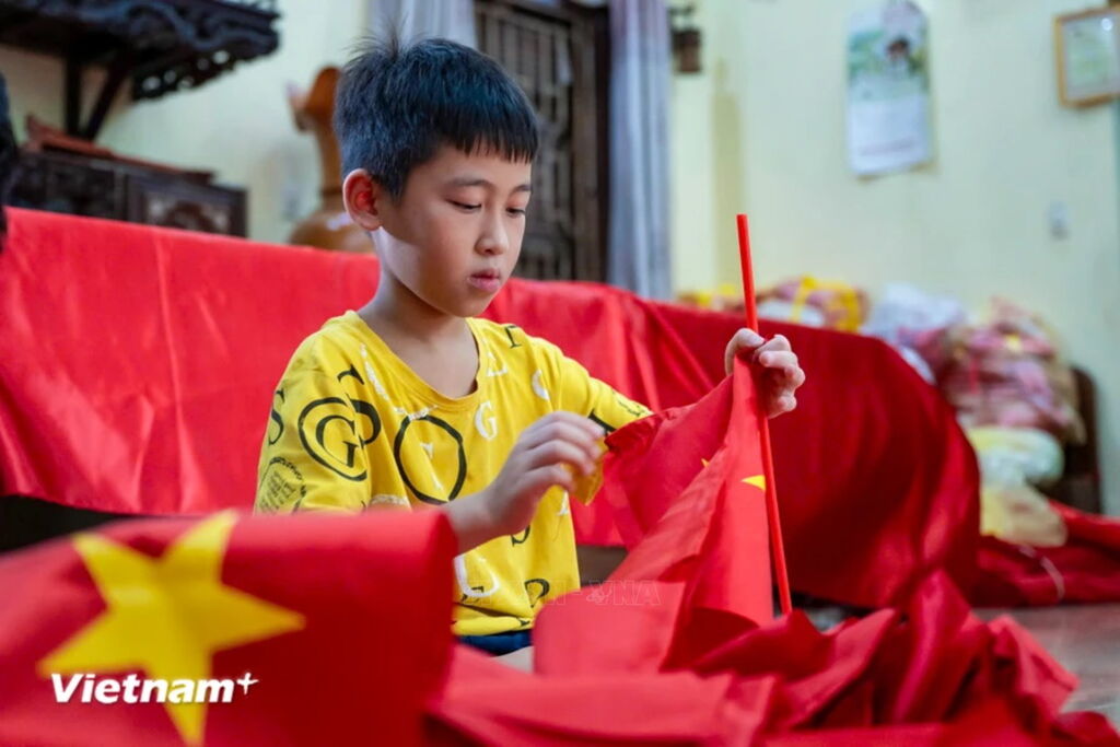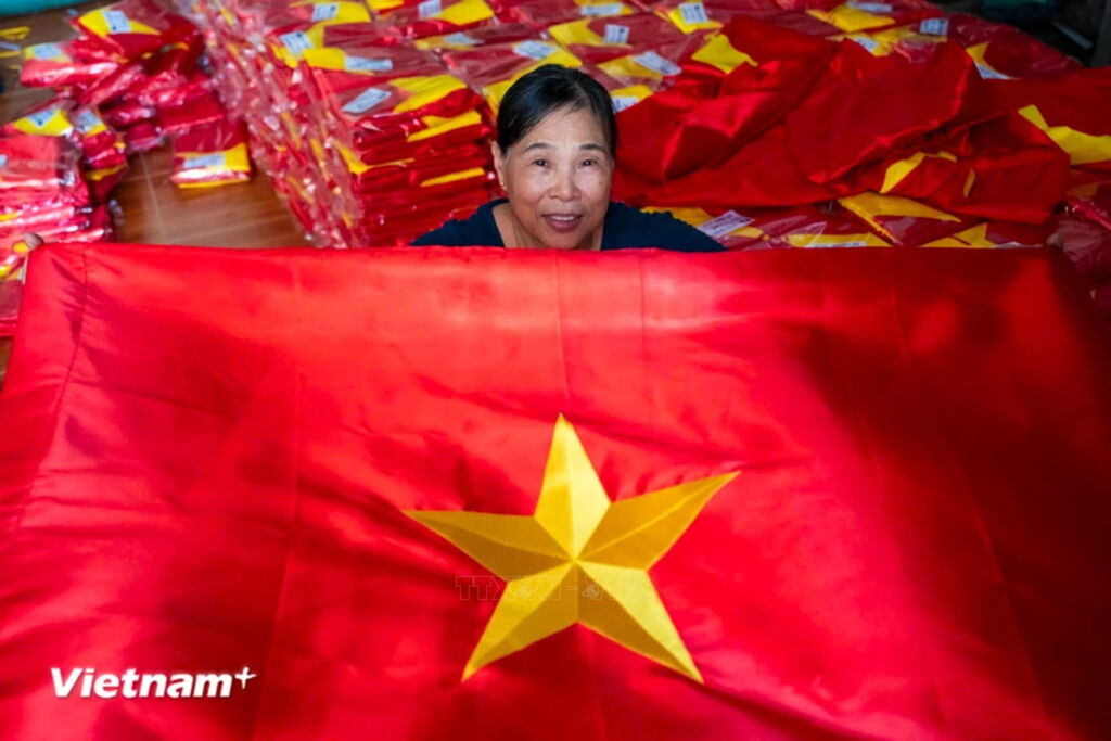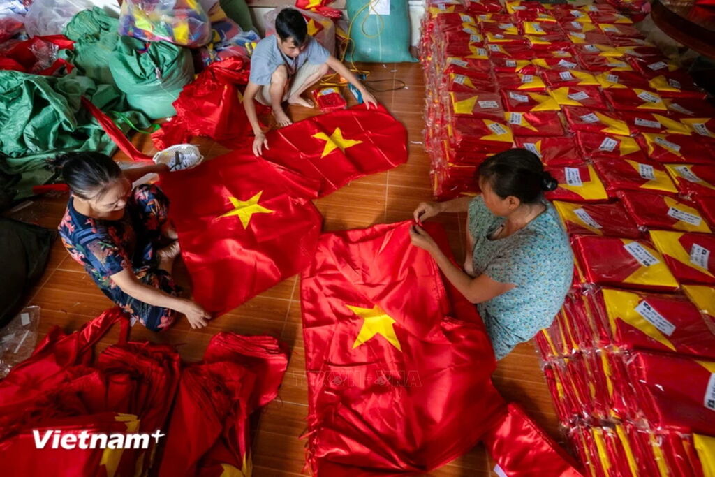 Những ngày cuối tháng 8, khi cả nước đang hướng về kỷ niệm 79 năm ngày Quốc khánh 2/9 cũng là lúc làng nghề Từ Vân (huyện Thường Tín, Hà Nội) lại tất bật làm việc để kịp cung ứng hàng vạn lá cờ cho người dân cả nước đón "Tết độc lập." (Ảnh: Minh Sơn/Vietnam+)Nằm cách Thủ đô Hà Nội khoảng 30km, gần 80 năm qua, làng Từ Vân được biết đến là địa chỉ chuyên sản xuất những cờ Tổ quốc. (Ảnh: Minh Sơn/Vietnam+)Theo lời kể lại của người dân trong làng, tháng 8/1945, để chuẩn bị cho ngày tổng khởi nghĩa, Uỷ ban kháng chiến đã mời các nghệ nhân của làng Từ Vân thêu, làm cờ Tổ quốc. Những nghệ nhân sau đó được tuyển vào Hợp tác xã Cờ đỏ trên phố Hàng Bông. Đó là dấu mốc để nghề may cờ Tổ quốc của làng Từ Vân ra đời. (Ảnh: Minh Sơn/Vietnam+)Tại làng Từ Vân, có nhiều gia đình đã truyền nghề may cờ Tổ quốc qua 4 thế hệ. Để thêu một lá cờ bằng tay mất 2-3 ngày. (Ảnh: Minh Sơn/Vietnam+)Nếu như trước đây việc may cờ chủ yếu làm thủ công bằng tay thì đến nay, các hộ sản xuất quy mô lớn tại làng đều trang bị máy móc hiện đại, tự động giúp các lá cờ được hoàn thiện chính xác cao, cải thiện năng suất. (Ảnh: Minh Sơn/Vietnam+)Mỗi công đoạn đều được những người dân làng Từ Vân thực hiện tỉ mỉ, đầy tâm huyết. (Ảnh: Minh Sơn/Vietnam+)Những ngày này, người dân tại các xưởng may cờ làm việc hết công suất để đáp ứng nhu cầu trước dịp Quốc khánh và khai giảng năm học mới. (Ảnh: Minh Sơn/Vietnam+)Các xưởng may trong làng lúc nào cũng ngập tràn trong sắc đỏ-vàng, máy móc chạy hết công suất để đáp ứng các đơn hàng liên tục. (Ảnh: Minh Sơn/Vietnam+)Có lẽ với những người dân làng Từ Vân, may cờ là sự may mắn, vinh dự không phải ai cũng có. Mỗi lá cờ người dân Từ Vân làm ra đều mang đến cho họ niềm tự hào vì mang một phần hồn của dân tộc. (Ảnh: Minh Sơn/Vietnam+)Những lá cờ Tổ quốc của làng Từ Vân bây giờ đã tung bay trên khắp phố phường của Thủ đô, trên khắp nẻo đường của đất nước. (Ảnh: Minh Sơn/Vietnam+)