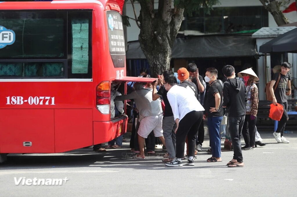 | Hành khách lấy hành lý phía sau xe khách sau hành trình từ các tỉnh, thành trở về Hà Nội. (Ảnh: Hoài Nam/Vietnam+) |