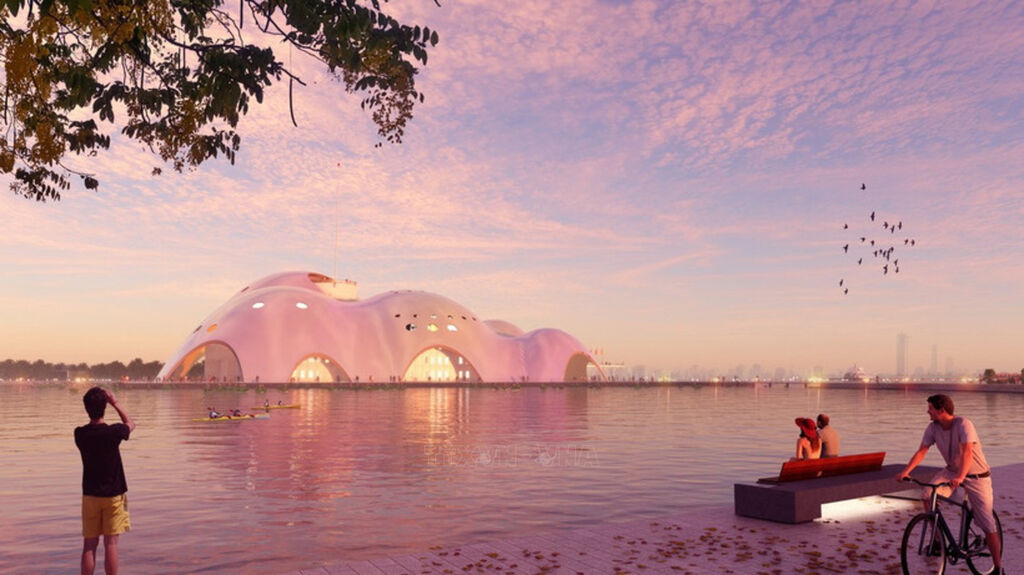 Được tạo hình sóng nước Hồ Tây với lớp vỏ ceramic phản chiếu ánh sáng ngọc trai, mái vòm không chỉ là dấu ấn mỹ học mang tính nhận diện của nhà hát, mà chất liệu bêtông còn đưa công trình hướng đến tính bền vững và giảm lượng carbon ẩn trong kết cấu, so với các dạng kết cấu truyền thống, góp phần vào mục tiêu thân thiện với môi trường.