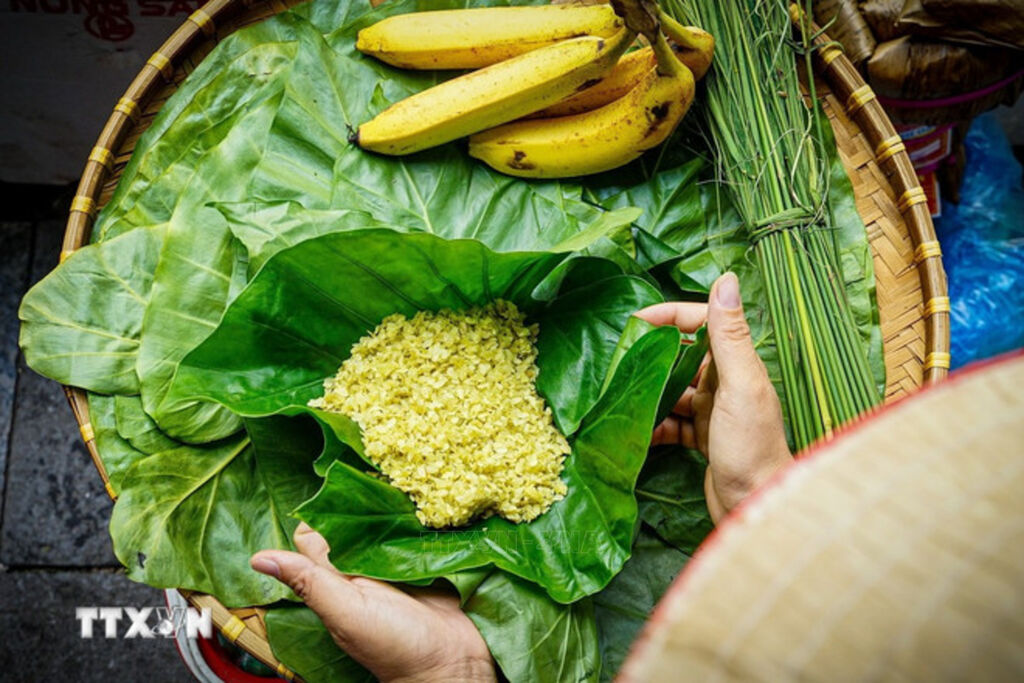 Cốm tươi Hà Nội có màu xanh mạ pha ánh vàng đặc trưng, đó là màu của lá lúa non nhuộm cho những hạt cốm.