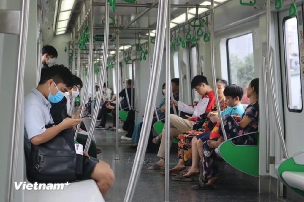 | Tàu điện trên cao đã trở thành phương tiện được đông đảo người dân Thủ đô lựa chọn. (Ảnh: PV/Vietnam+) |