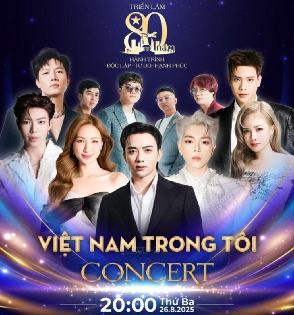 Concert "Việt Nam trong tôi" do Bộ Văn hóa, Thể thao và Du lịch chỉ đạo tổ chức vào lúc 20h ngày 26/8 tại Trung tâm Triển lãm Quốc gia, là một phần trong chuỗi hoạt động Triển lãm thành tựu kinh tế - xã hội nhân dịp kỷ niệm 80 năm Ngày Quốc khánh (2/9/1945-2/9/2025), nhằm tôn vinh giá trị lịch sử và tinh thần dân tộc.